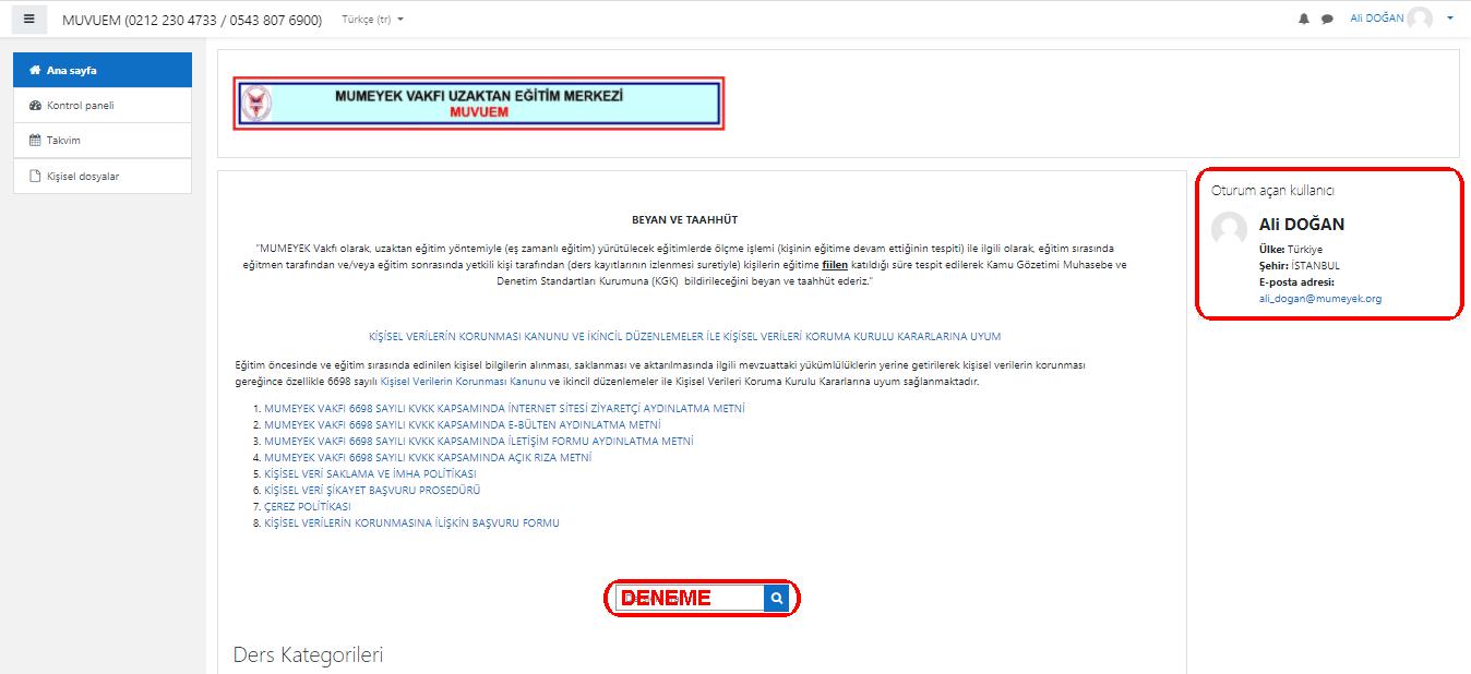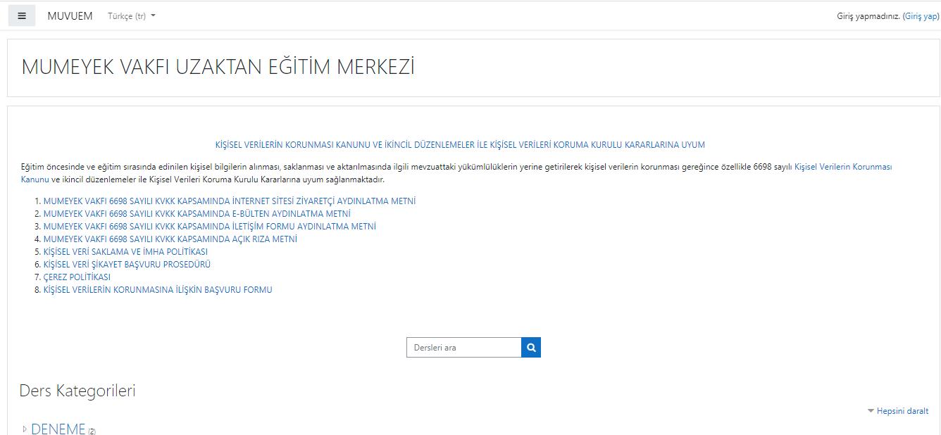 ANA SAYFA içinde BEYAN VE TAAHHÜT ile KİŞİSEL VERİLERİN KORUNMASI KANUNU VE İKİNCİL DÜZENLEMELER İLE KİŞİSEL VERİLERİ KORUMA KURULU KARARLARINA UYUM konularını incelediktein sonra DERSLERİ ARA bölümüne DENEME yazdıktan sonra ARA tuşunu tıklayınız. 12.