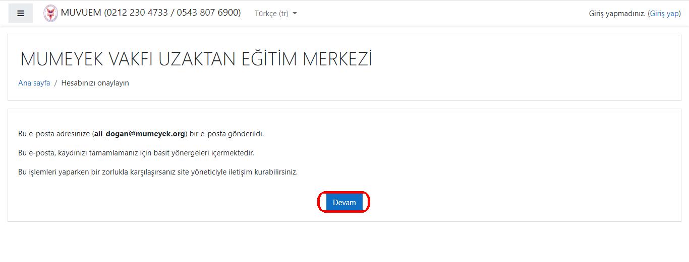 HESABINIZIN ONAY mesajını alacaksınız, buradan çıkmak için DEVAM tuşuna basınız. ONAY işleminizi hızlandırmak için 0212 230 4733 / 0543 807 6900 nolu telefonlarımızı arayabilirsiniz. 10.