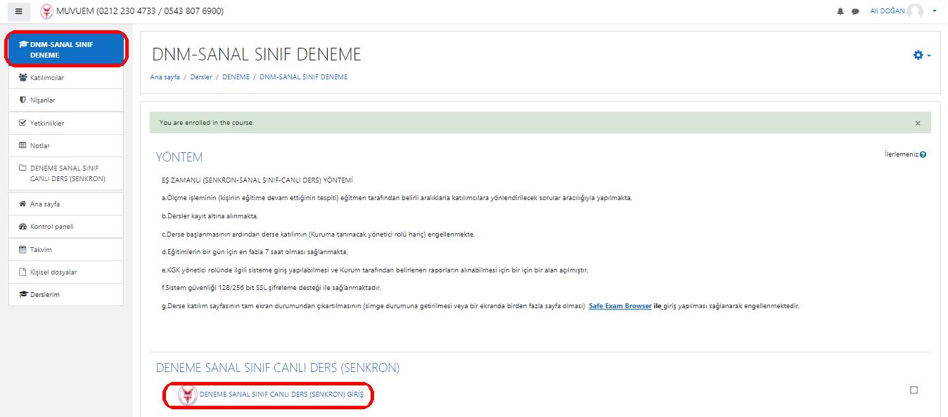DENEMEK / KATILMAK istediğiniz DERSE GİRMEK için uygulanan YÖNTEM incelendikten sonra SINIF adının altındaki DENEME SANAL SINIF CANLI DERS (SENKRON) GİRİŞ bağlantısını tıklayarak DERSİ giriş yapabilirsiniz. 15.