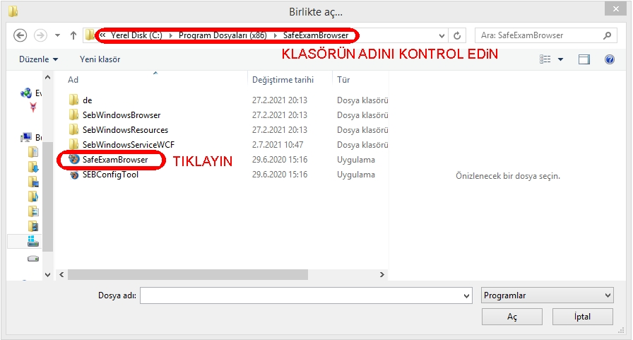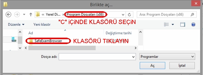 Yerel Disk (C:) > Program Dosyaları (x86) > Safe Exam Browser klasörü adını KONTROL EDİN